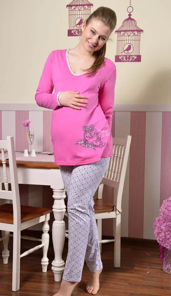 Piżama damska z długim rękawem, uszyta z miękkiej bawełny (100%). Koszulka lekko rozszerzana, polecana także przyszłym mamom. Dekolt i rękawy ozdobione wzorzystą lamówką, nawiązującą wzorem do spodni. Spodnie długie, proste, luźno zakończone.