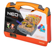 Plac budowy z piaskiem kinetycznym, materiał PP, całość dostarczona w plastikowej walizce, przeznaczone dla dzieci powyżej 3 lat, 750g piasku kinetycznego, w zestawie koparko-ładowarka, koparka na gąsienicach, walec, dźwig, trzy folie do przechowywania piasku, foremki i akcesoria do piasku, Certyfikat CE