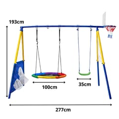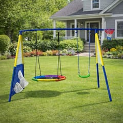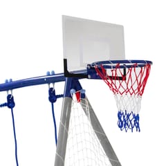 Ogrodowy plac zabaw 4w1 to nowoczesny i funkcjonalny zestaw rekreacyjny, który zapewnia dzieciom aktywną, bezpieczną i różnorodną zabawę na świeżym powietrzu. Dzięki przemyślanej konstrukcji łączy w sobie aż cztery różne formy zabawy: dwie huśtawki, kosz do koszykówki z piłką oraz matę celnościową, co sprawia, że każde dziecko znajdzie coś dla siebie.