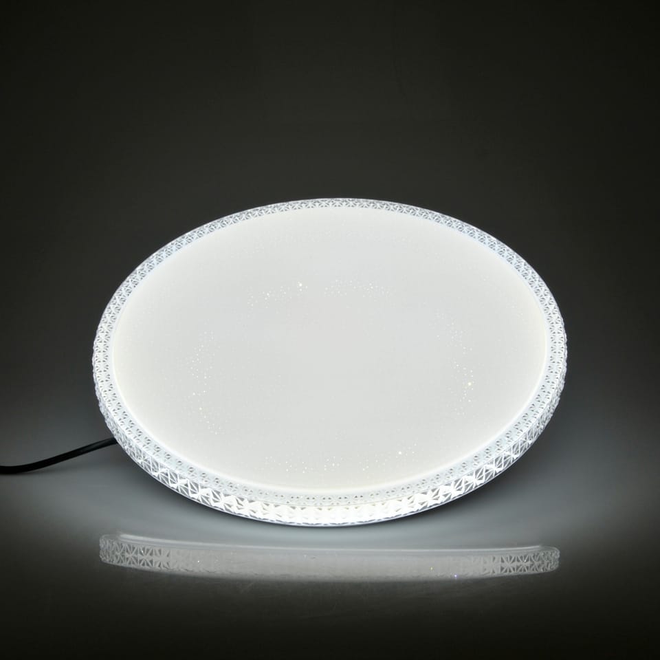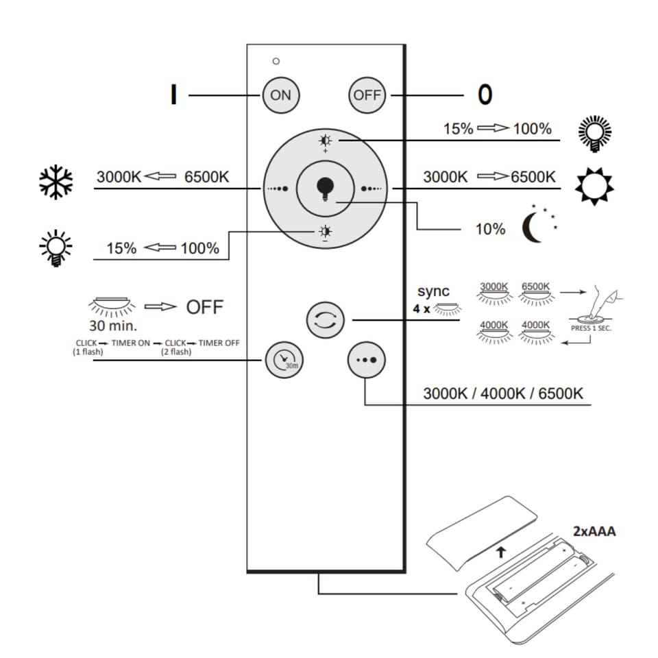 Plafon z pilotem za pomocą którego można płynnie zmienić barwę świecenia od ciepłej białej przez neutralną po zimno białą (3000K-4000K-6500K) oraz wybrać ilość światła, plafon z możliwością ściemniania.