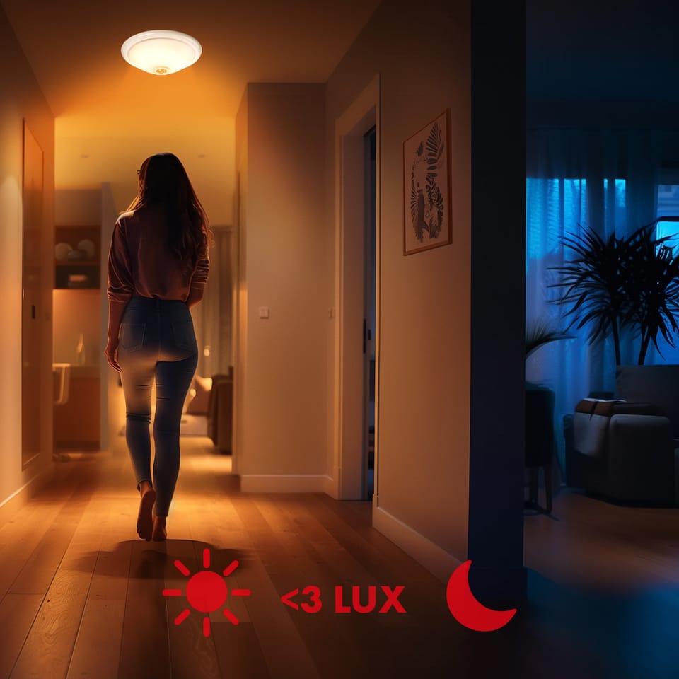Plafon LED przeznaczony do automatycznego włączania oświetlania w pomieszczeniach takich jak: klatki schodowe, korytarze, piwnice, garaże, szatnie, toalety, itd. Dzięki czujnikowi na podczerwień produkt umożliwia automatyczne załączenie obciążenia, po wykryciu ruchu, z kolei dzięki czujnikowi światłoczułemu można ustawić poziom natężenia światła, przy jakim zaczyna wykrywać ruch. Z naszym plafonem z czujnikiem ruchu zaoszczędzisz na rachunkach za prąd, ponieważ oświetlenie będzie się załączać tylko wtedy, kiedy to potrzebne! Jako źródło światła stosuje się dwie żarówki z gwintem E27 o maksymalnej mocy 40W każda. Działa także z oświetleniem LED.