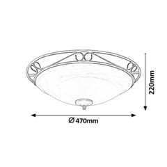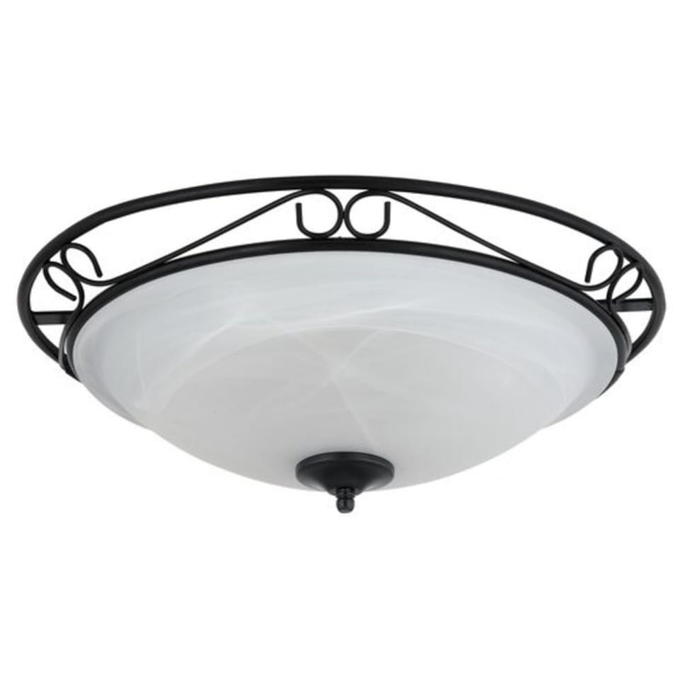 Cechy- Okrągła lampa sufitowa Athen będzie ciekawym dodatkiem do wyposażenia salonu, jadalni lub sypialni- Uzupełnieniem żelaznej oprawy w kolorze czarnym jest biały klosz ze szkła alabastrowego- Średnica lampy wynosi 47 cm, a jej wysokość to 22 cm- Lampa wyposażona jest w 3 oprawy na żarówki typu E27- Styl: śródziemnomorski