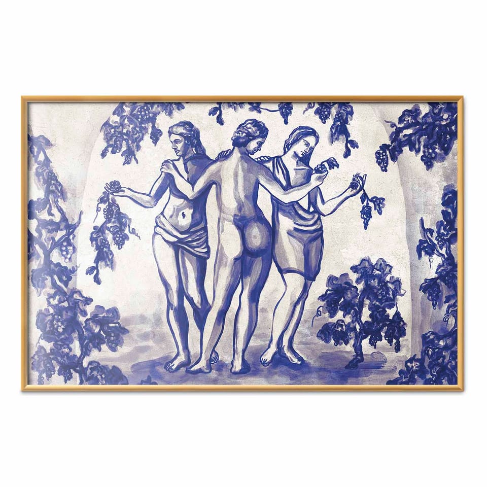 Plakat - Antyczna winnica - trzy kobiety w portalu malowane niebieskim tuszem rozmiar 60x40, wykończenie Rama złota