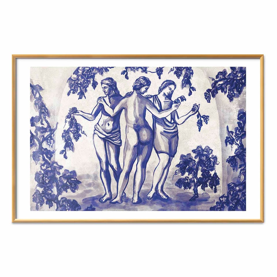 Plakat - Antyczna winnica - trzy kobiety w portalu malowane niebieskim tuszem rozmiar 90x60, wykończenie Rama złota z marginesem