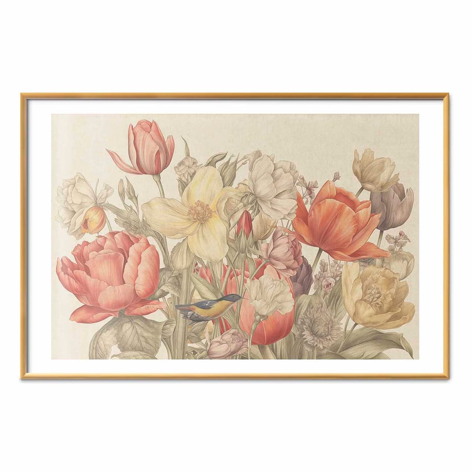 Plakat - Bukiet kwiatów na kremowym tle rozmiar 60x40, wykończenie Rama złota z marginesem