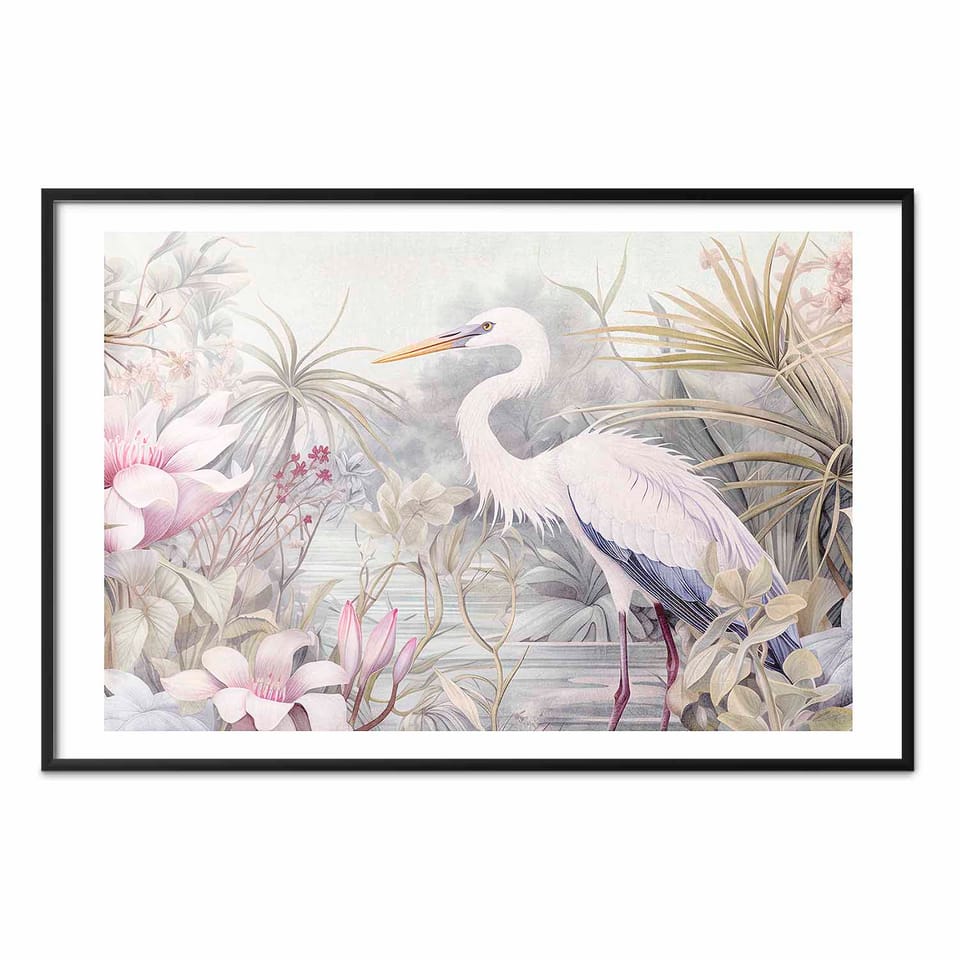 Plakat - Czapla brodząca w stawie - ilustracja w jasnej kolorystyce rozmiar 90x60, wykończenie Rama czarna z marginesem