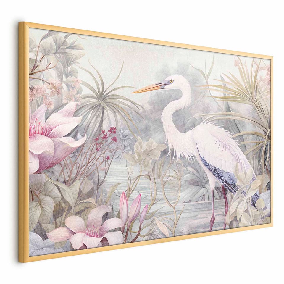 Plakat - Czapla brodząca w stawie - ilustracja w jasnej kolorystyce rozmiar 90x60, wykończenie Rama złota
