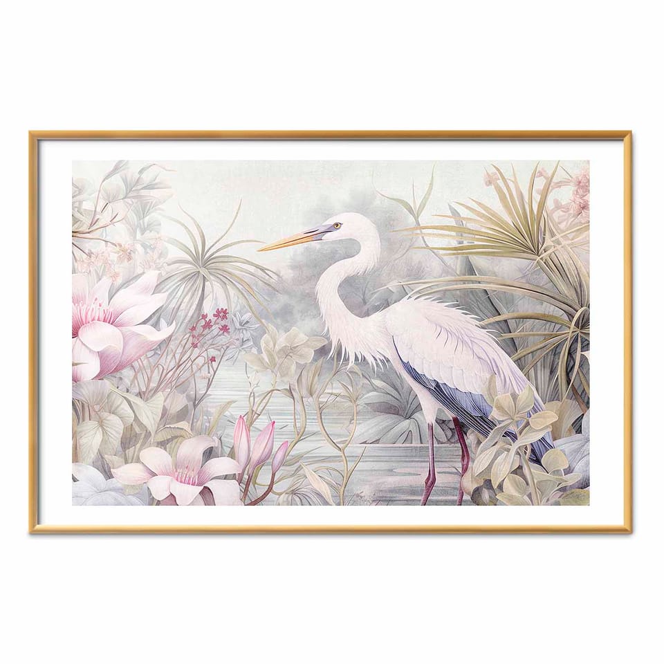 Plakat - Czapla brodząca w stawie - ilustracja w jasnej kolorystyce rozmiar 90x60, wykończenie Rama złota z marginesem