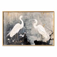 Plakat - Czaple i kwiat wiśni - ilustracja w orientalnym stylu przedstawiająca ptaki rozmiar 30x21, wykończenie Rama złota