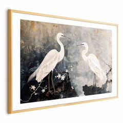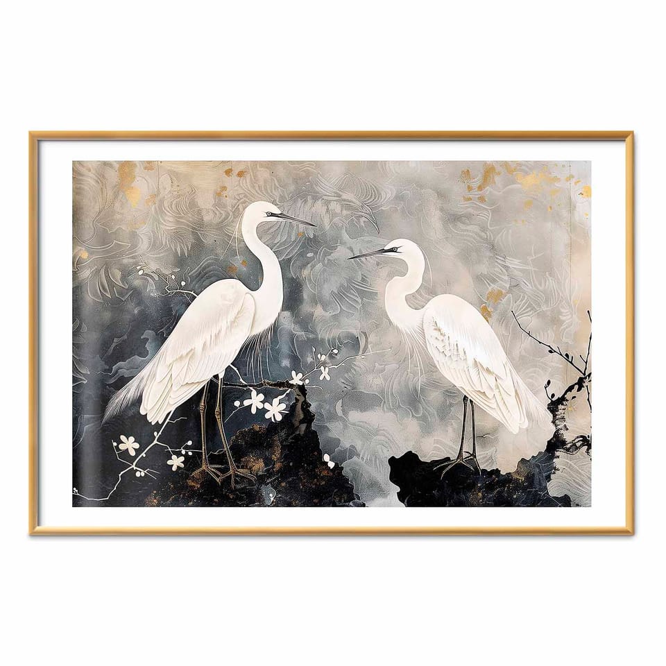 Plakat - Czaple i kwiat wiśni - ilustracja w orientalnym stylu przedstawiająca ptaki rozmiar 60x40, wykończenie Rama złota z marginesem