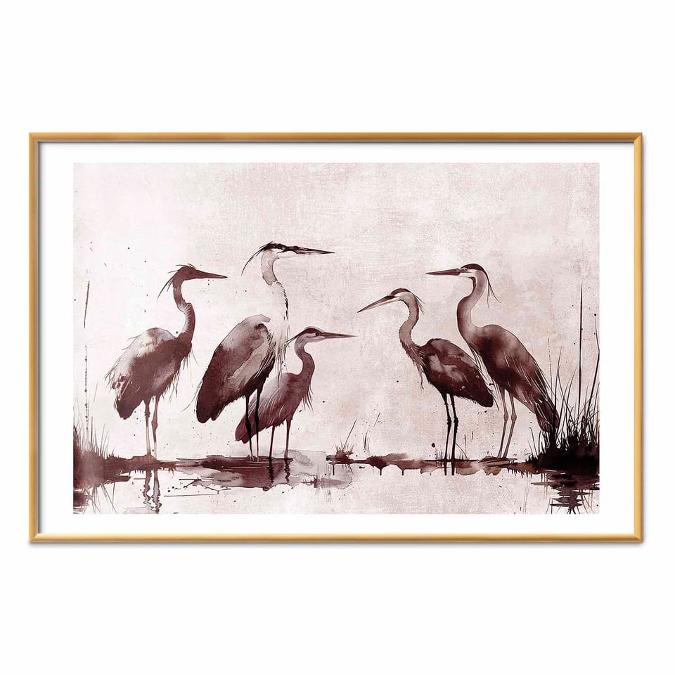 Plakat - Czaple malowane tuszem rozmiar 42x29.7, wykończenie Rama złota z marginesem