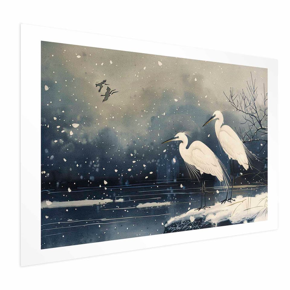 Plakat - Czaple nad zimowym stawem - ilustracja w stylu japońskiego w ciemnej kolorystyce rozmiar 30x21, wykończenie Bez ramy z marginesem