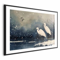Plakat - Czaple nad zimowym stawem - ilustracja w stylu japońskiego w ciemnej kolorystyce rozmiar 60x40, wykończenie Rama czarna z marginesem