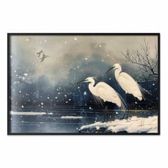 Plakat - Czaple nad zimowym stawem - ilustracja w stylu japońskiego w ciemnej kolorystyce rozmiar 90x60, wykończenie Rama czarna