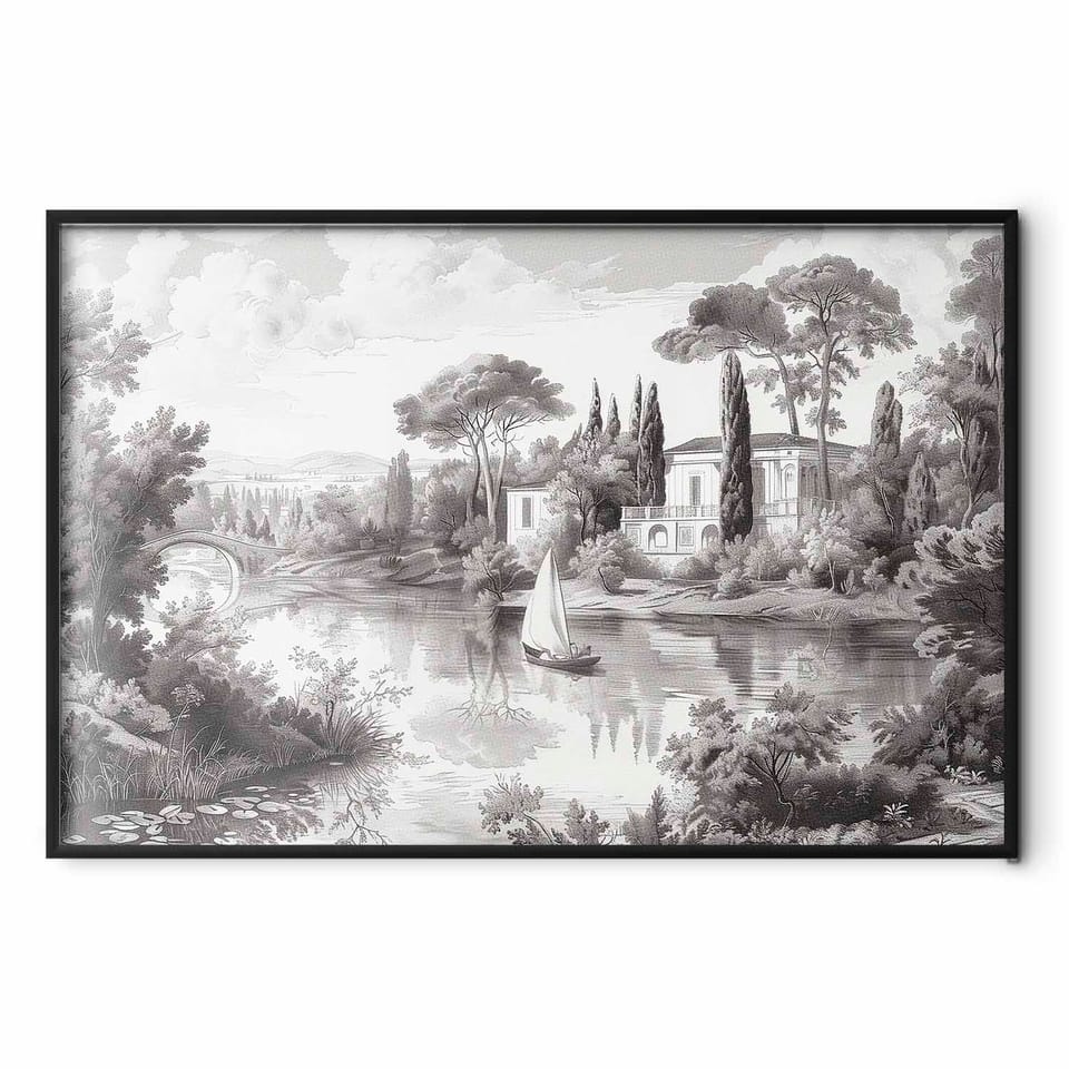 Plakat - Czarno-biały pejzaż vintage ze stawem rozmiar 42x29.7, wykończenie Rama czarna