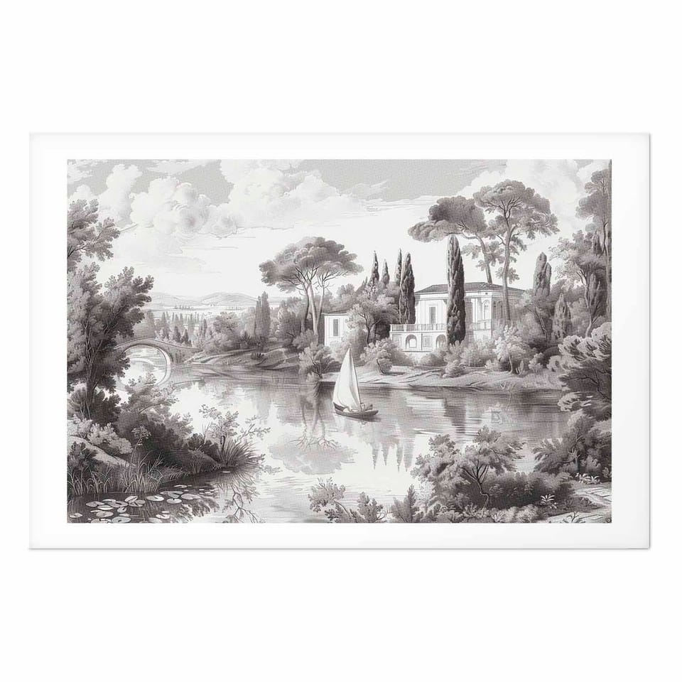 Plakat - Czarno-biały pejzaż vintage ze stawem rozmiar 90x60, wykończenie Bez ramy z marginesem