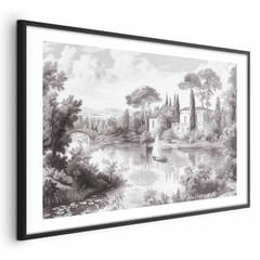 Plakat - Czarno-biały pejzaż vintage ze stawem rozmiar 90x60, wykończenie Rama czarna z marginesem