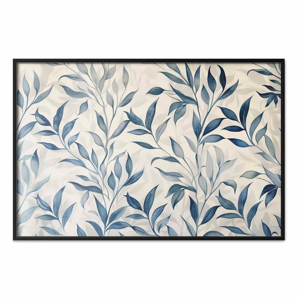 Plakat - Delikatny motyw botaniczny z niebieskimi listkami rozmiar 60x40, wykończenie Rama czarna