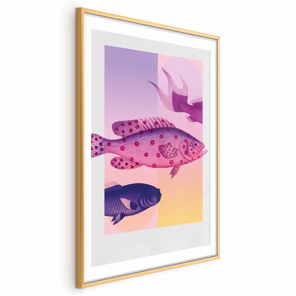 Plakat - Fantazyjne Ryby - artystyczna ilustracja ryb na kolorowym tle rozmiar 40x60, wykończenie Rama złota z marginesem