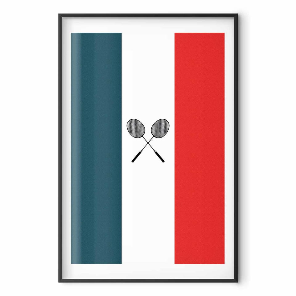 Plakat - Flagi Francji i czarne paletki do badmintona rozmiar 40x60, wykończenie Rama czarna z marginesem