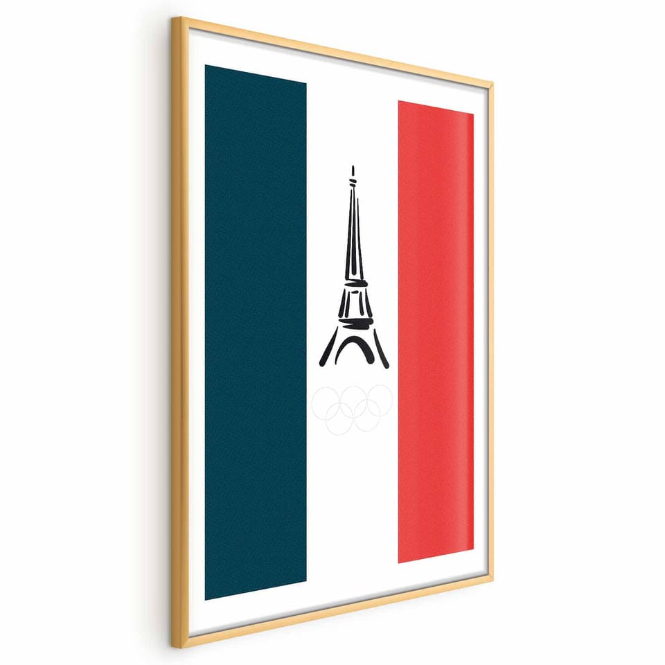 Plakat - Graficzna wieża Eiffla na tle flagi Francji rozmiar 29.7x42, wykończenie Rama złota z marginesem