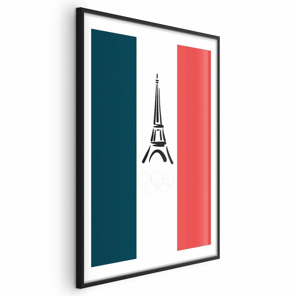 Plakat - Graficzna wieża Eiffla na tle flagi Francji rozmiar 60x90, wykończenie Rama czarna z marginesem