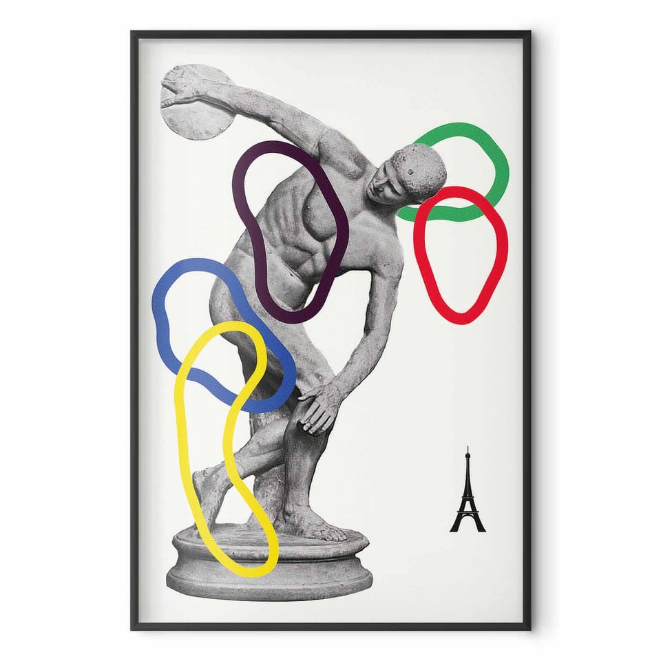Plakat - Grafika kolaż - rzut dyskiem - rzeźba rozmiar 40x60, wykończenie Rama czarna