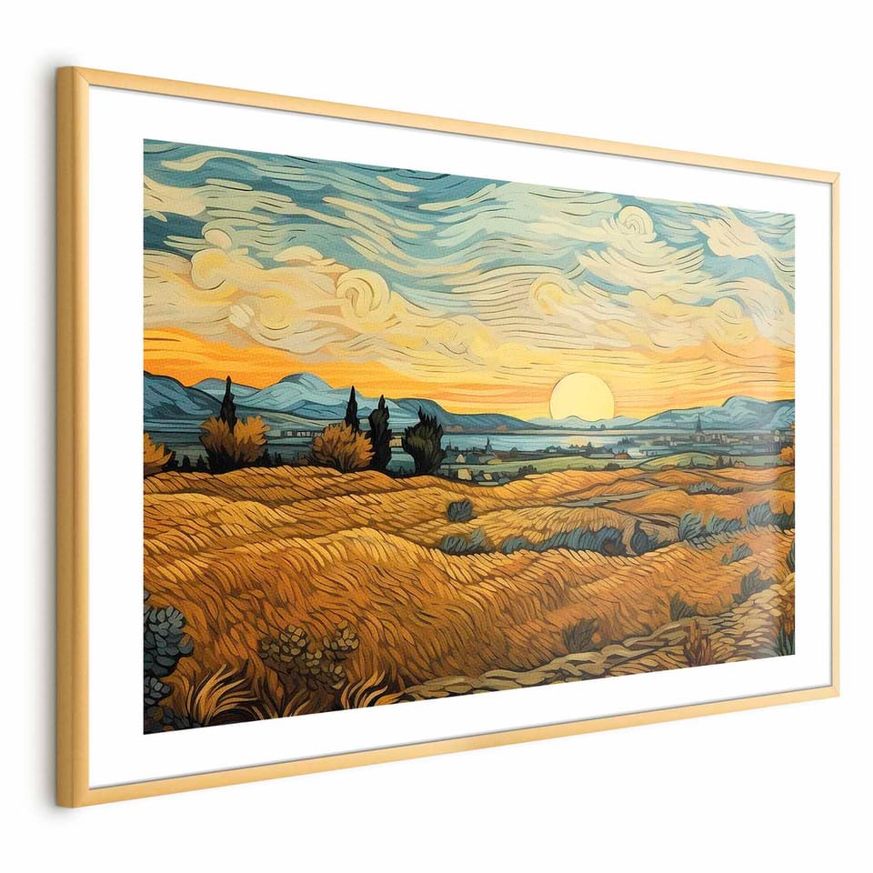 Plakat - Impresjonistyczne łany - namalowany złoty krajobraz z łanami zboża rozmiar 60x40, wykończenie Rama złota z marginesem