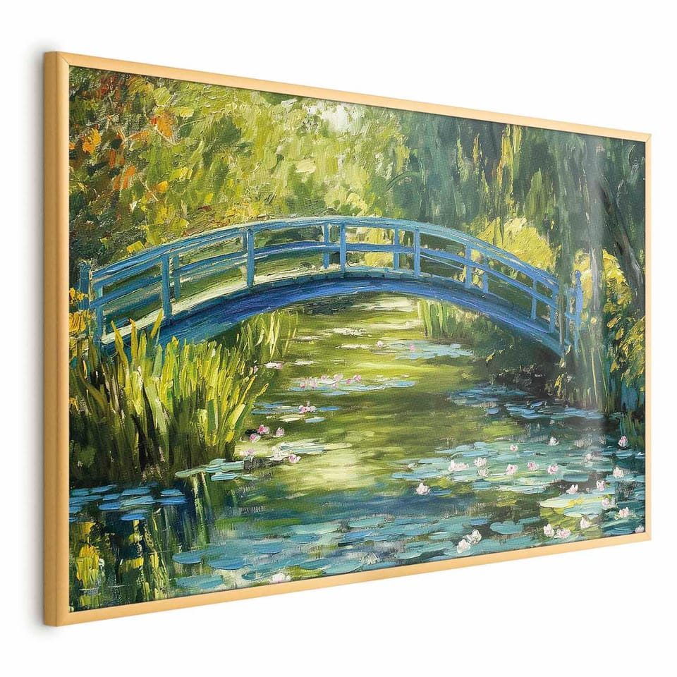 Plakat - Impresjonistyczny mostek - obraz mostu na malowniczym tle rozmiar 60x40, wykończenie Rama złota