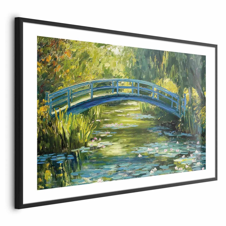 Plakat - Impresjonistyczny mostek - obraz mostu na malowniczym tle rozmiar 90x60, wykończenie Rama czarna z marginesem