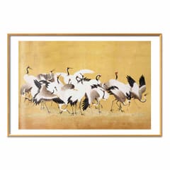 Plakat - Japońskie żurawie - stado ptaków na tle w odcieniu złota na podstawie obrazu Ishida Yūtei rozmiar 30x21, wykończenie Rama złota z marginesem