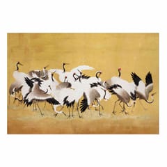 Plakat - Japońskie żurawie - stado ptaków na tle w odcieniu złota na podstawie obrazu Ishida Yūtei rozmiar 60x40, wykończenie Bez ramy