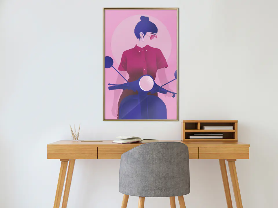 Plakat "Plakat - Kobieta na skuterze [Poster]" jest owocem pracy naszego teamu designerów, którzy dbają o to, aby nasze propozycje były zawsze na czasie. Jest on dostępny w kilku formatach i rodzajach opraw, dzięki czemu bez problemu wybierzesz opcję odpowiadającą Twoim potrzebom.