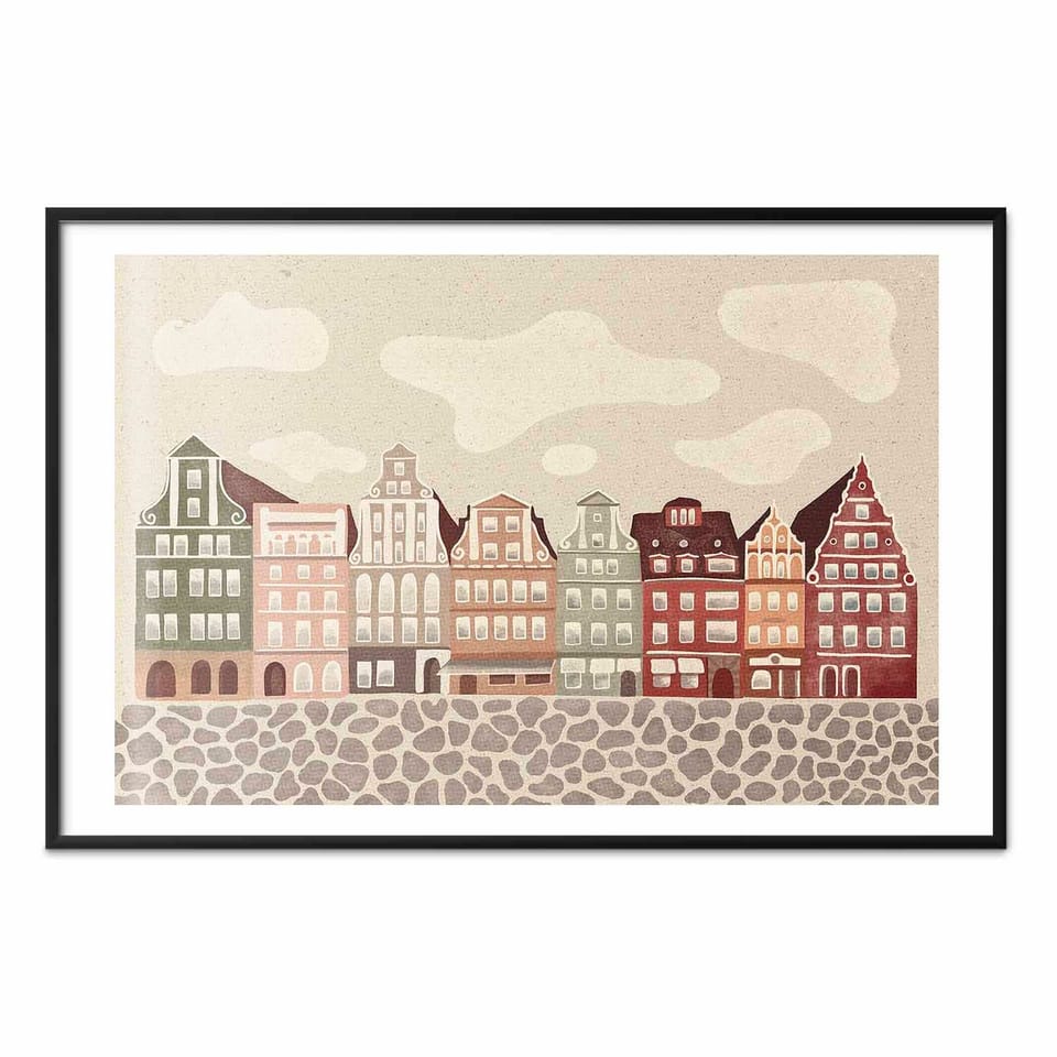 Plakat - Kolorowe Fasady - zabytkowe wrocławskie kamienice na tle nieba i brukowanej uliczki rozmiar 90x60, wykończenie Rama czarna z marginesem