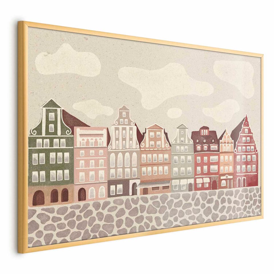 Plakat - Kolorowe Fasady - zabytkowe wrocławskie kamienice na tle nieba i brukowanej uliczki rozmiar 90x60, wykończenie Rama złota