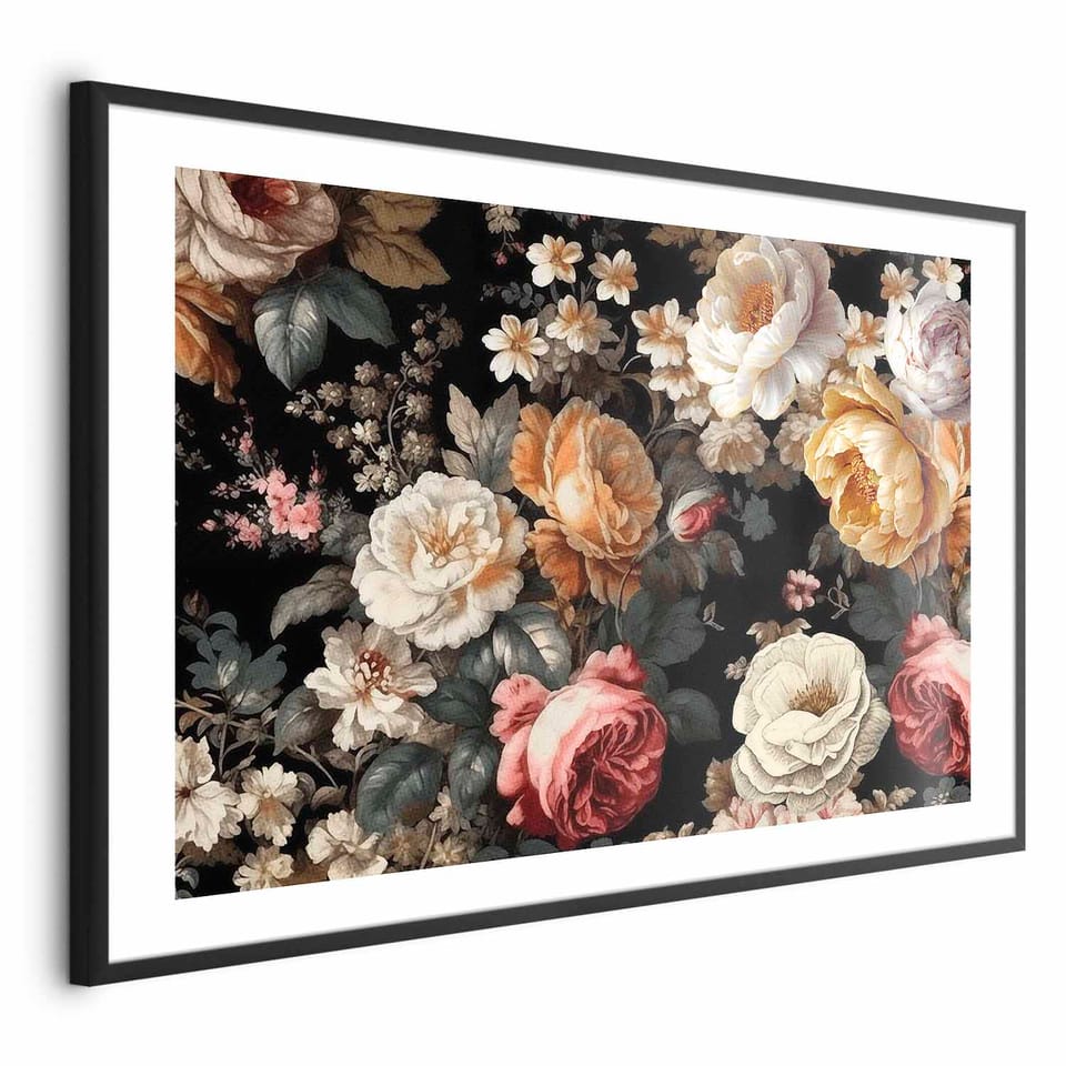 Plakat - Kolorowe kwiaty na czarnym tle rozmiar 42x29.7, wykończenie Rama czarna z marginesem