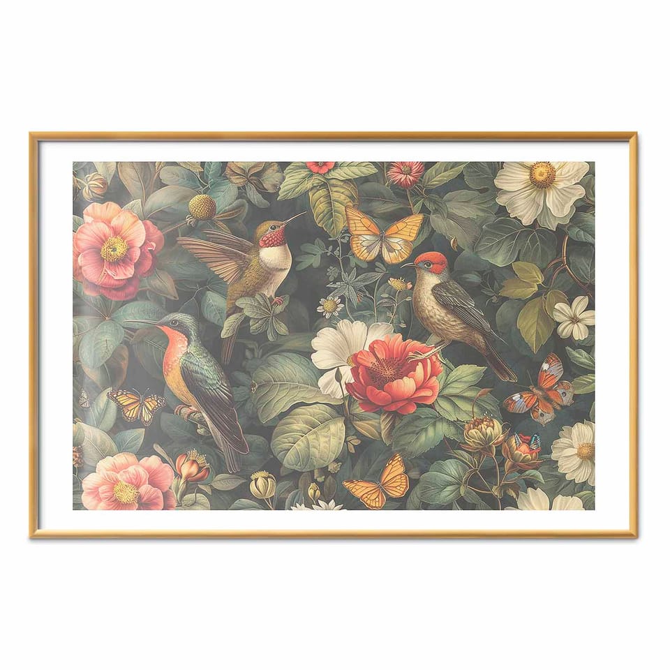 Plakat - Kwiaty; ptaki i motyle - ilustracja w stylu vintage rozmiar 30x21, wykończenie Rama złota z marginesem