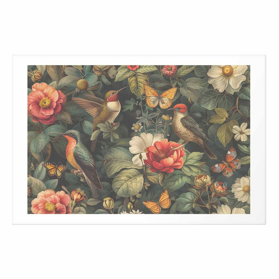 Plakat - Kwiaty; ptaki i motyle - ilustracja w stylu vintage rozmiar 90x60, wykończenie Bez ramy z marginesem