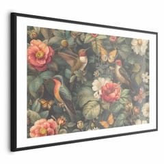 Plakat - Kwiaty; ptaki i motyle - ilustracja w stylu vintage rozmiar 90x60, wykończenie Rama czarna z marginesem