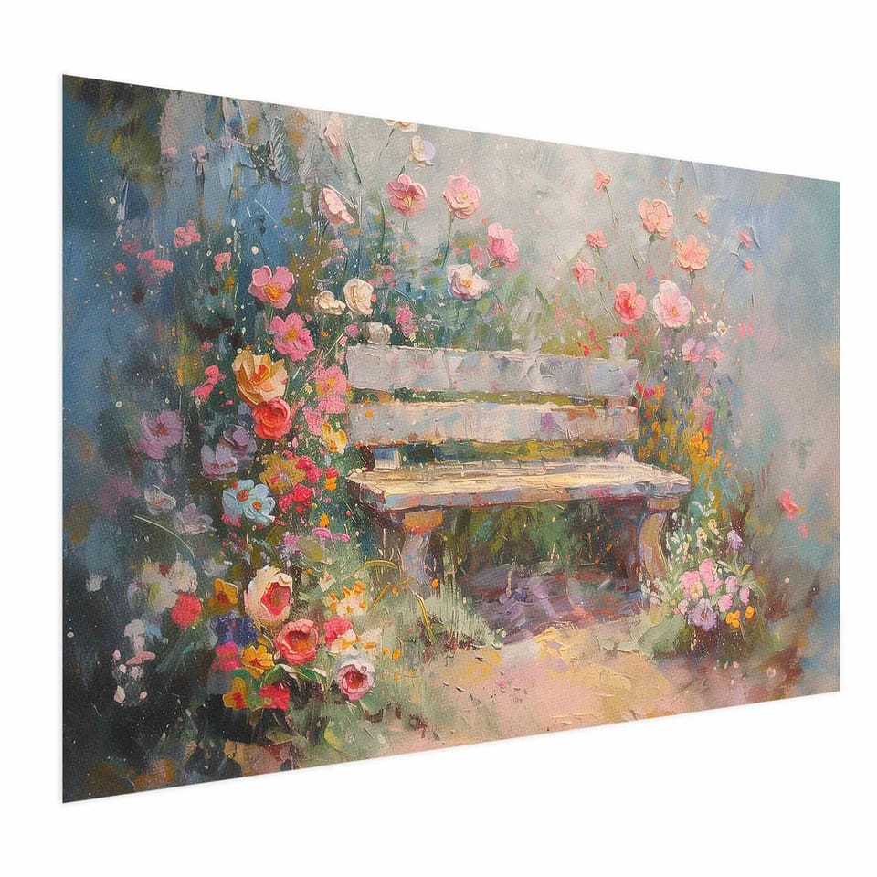 Plakat - Kwiecista ławeczka - obraz w stylu impresjonistycznym pełen kwiatów rozmiar 42x29.7, wykończenie Bez ramy