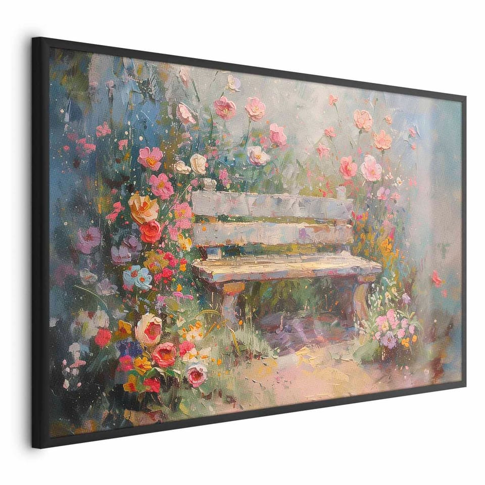 Plakat - Kwiecista ławeczka - obraz w stylu impresjonistycznym pełen kwiatów rozmiar 60x40, wykończenie Rama czarna