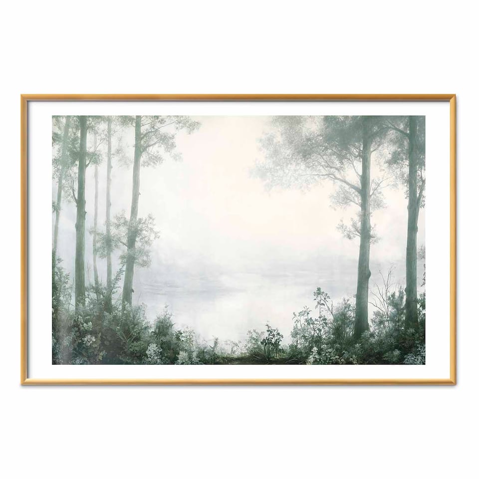 Plakat - Lasek i staw w spatynowanej zieleni rozmiar 30x21, wykończenie Rama złota z marginesem