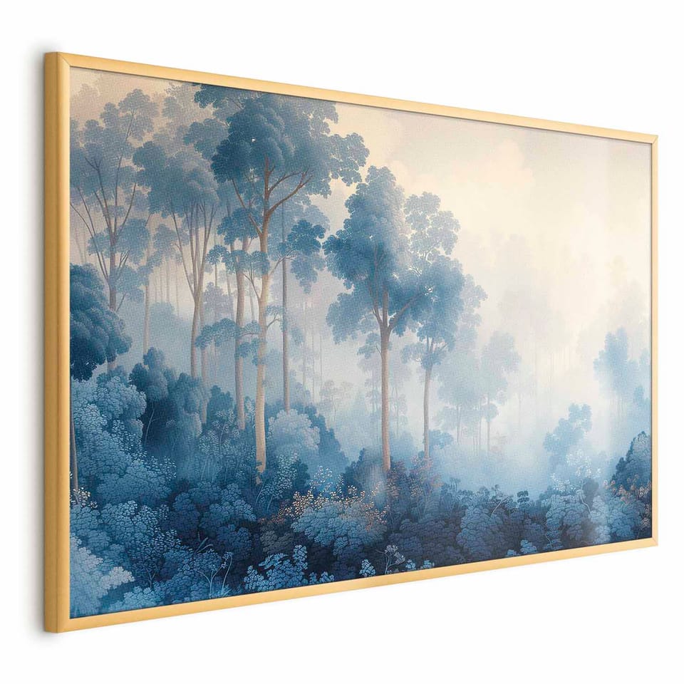 Plakat - Lasek w mglistych odcieniach błękitu rozmiar 30x21, wykończenie Rama złota