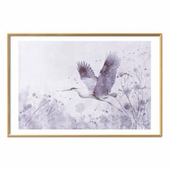 Plakat - Majestatyczny lot - żuraw w locie w monochromatycznej; chłodnej kolorystyce rozmiar 30x21, wykończenie Rama złota z marginesem