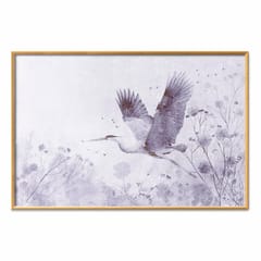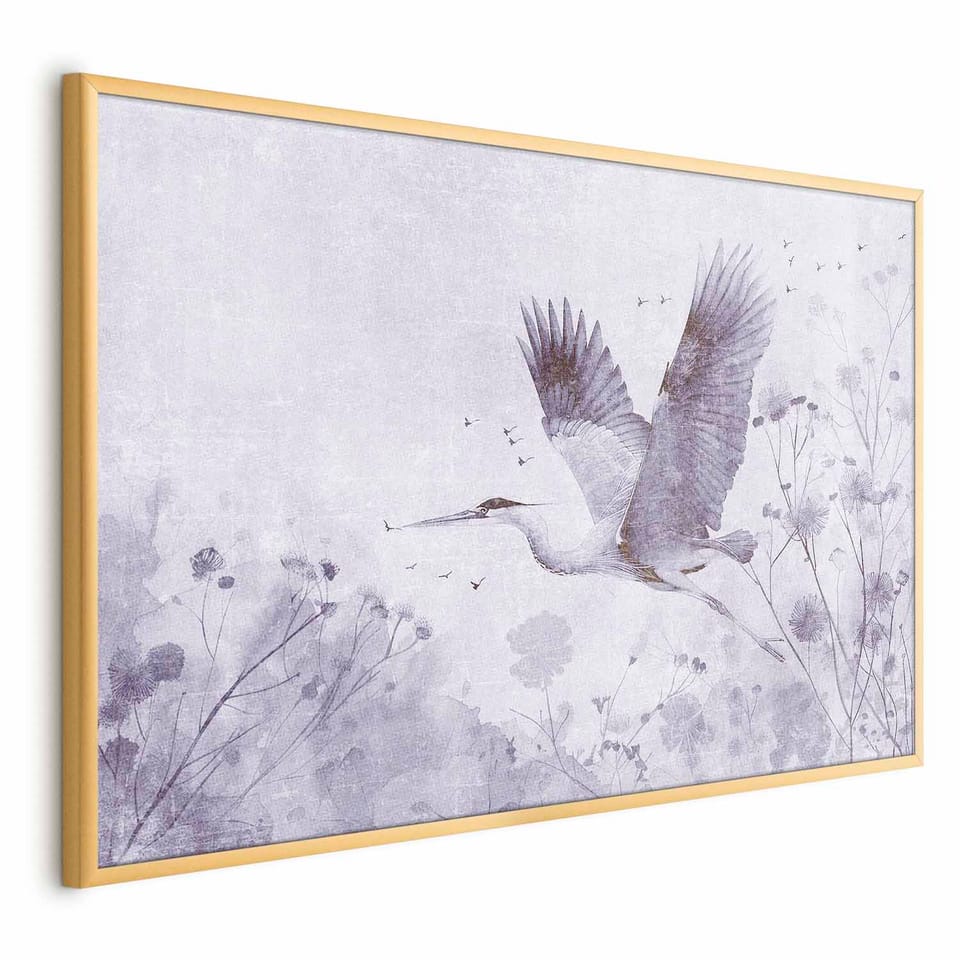 Plakat - Majestatyczny lot - żuraw w locie w monochromatycznej; chłodnej kolorystyce rozmiar 60x40, wykończenie Rama złota