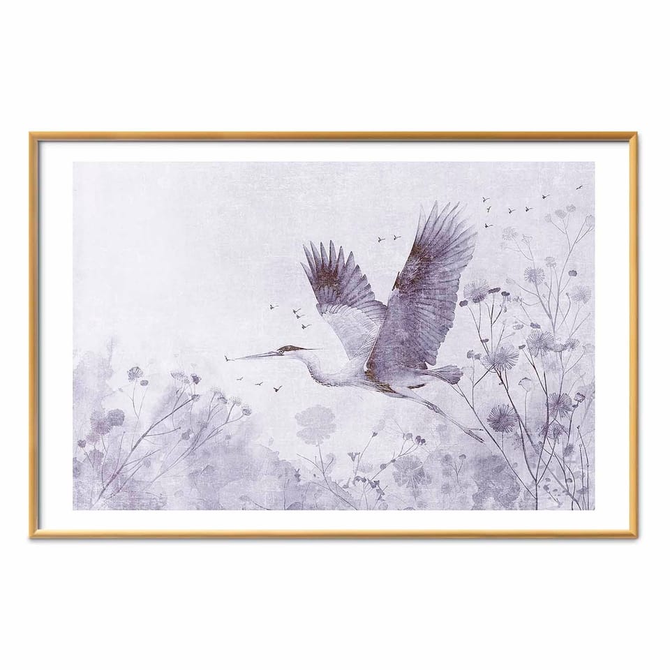 Plakat - Majestatyczny lot - żuraw w locie w monochromatycznej; chłodnej kolorystyce rozmiar 60x40, wykończenie Rama złota z marginesem