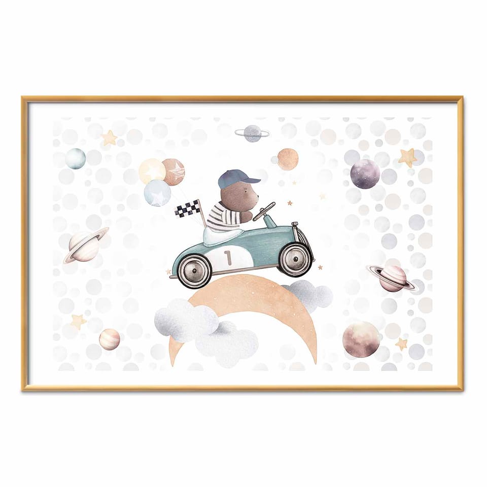 Plakat - Miś w wyścigówce rozmiar 42x29.7, wykończenie Rama złota z marginesem