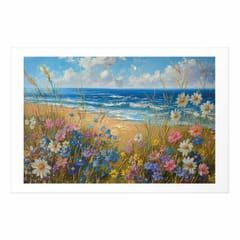 Plakat - Morski krajobraz - polne kwiaty i widok na wzburzone morze rozmiar 60x40, wykończenie Bez ramy z marginesem