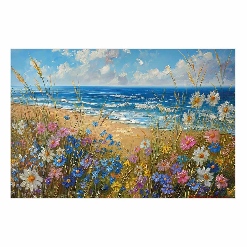 Plakat - Morski krajobraz - polne kwiaty i widok na wzburzone morze rozmiar 90x60, wykończenie Bez ramy