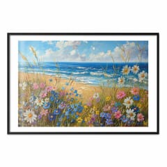Plakat - Morski krajobraz - polne kwiaty i widok na wzburzone morze rozmiar 90x60, wykończenie Rama czarna z marginesem